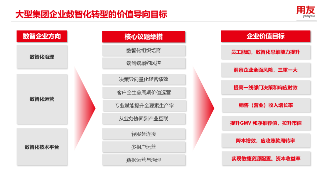 用友認(rèn)為,大型企業(yè)在需求重塑、產(chǎn)業(yè)調(diào)整、政策升級(jí)等多重變革力量交織下,數(shù)智化轉(zhuǎn)型難度與日俱增。對(duì)于這項(xiàng)復(fù)雜而漫長的工作來說,明確價(jià)值導(dǎo)向?qū)⒅破髽I(yè)拾級(jí)而上。